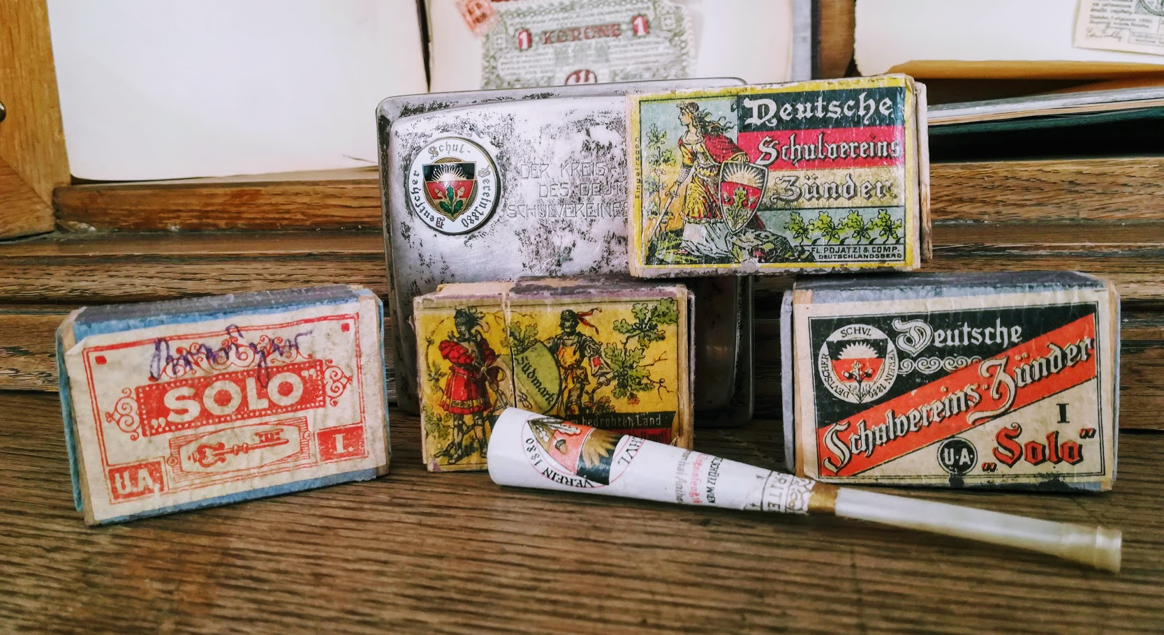 Der Deutsche Schulverein war sehr erfolgreich im Generieren von Spenden, aber auch im Verkauf von Promotionsartikeln: Die am weitesten verbreiteten Gegenstände waren Zündhölzer. Im Beitragsbild oben kann man einige der Zündholzschachteln von damals sehen, die heute noch im ÖLM-Archiv verwahrt werden.