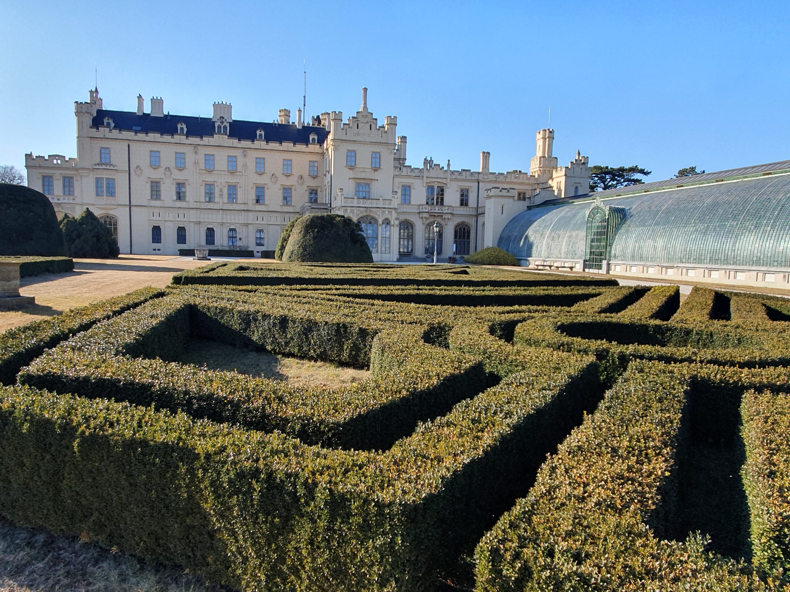 Feldsberg ist mit Eisgrub durch eine schnurgerade, 7 km lange Allee verbunden. Nicht wenige der Baumriesen sind hohl oder teilweise eingefallen. Während der Wochenenden in der Hauptsaison bevölkern Touristenmassen Eisgrub. Will man eine deutschsprachige Führung, wie z. B. für eine Reisegruppe der ÖLM im Herbst 2023, so muß man lange im Voraus buchen. Die junge blonde Führerin steht im kurzen rosa Nachthemd vor der Gruppe und erklärt, sie habe sich für diese „wie früher üblich“ gekleidet. Eine Frage nach dem Jahr 1945 wird sofort abgeblockt: „Das ist Politik!“ . Ich muß wieder an Erich denken…