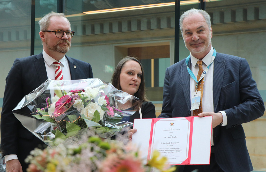 Mit der Würdigung der Historikerin Dr. Béata Márkus (im Bild mit Laudator Bathelt und ÖLM-Obmann Danneberg) für ihr herausragendes wissenschaftliches Werk wurde auch gleichzeitig eines Themas gedacht, von dem viele Angehörige der deutschen Minderheiten in Mittel und Osteuropa betroffen sind. Dr. Márkus, Oberassistentin an der Universität Pécs, gehört zu den profiliertesten Stimmen auf dem Gebiet der ungarndeutschen Geschichte. In ihrer Dissertation über die Deportation der Zivilbevölkerung der „Schwäbischen Türkei“ in die Sowjetunion (1944–1949) beleuchtet sie ein lange tabuisiertes Kapitel der ungarischen Nachkriegsgeschichte. Über 30.000 Menschen wurden zur Zwangsarbeit verschleppt – deren Stimmen, Schicksalen und Erinnerungen gibt Márkus