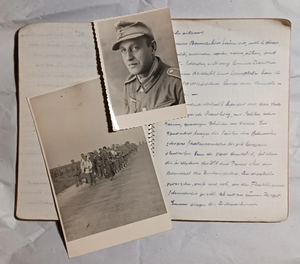 Straße, vom Feind eingesehn, liegt im Granatfeuer. Mit vollem Gepäck und Kisten Munition durchs Feuer. Die Insel in schönen Herbstfarben. Erinnerung an Löns. Eichen und Birken gilben. Elstern, Raben und Wildgänse beobachtet. […] Schlaf im Dünensand, im selbstgegrabenen Erdloch. Regen. Zeltblatt übers Loch gespannt, Füße frei. Granaten jaulen zum Feind. Einschläge. MG. Gewehrschüsse. HKL [Hauptkampflinie] – 500 m von uns. Wir bauen Stellungen im Dünensand. Ich schneide Weiden für Flechtwerk. Schlaf im Zelt. Bunker wird begonnen. Plötzlich abberufen. Nächtlicher Abmarsch. Von Ratas umflogen. […]